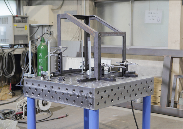 加工能力 : 3D定盤では小型、繊細な溶接作業から重量物の固定まで対応できます。 また縦横・碁盤状に配置されたグリッドと高さ、角度の調節が可能なクランプを使う事であらゆる形状のワークを正確に固定し、 歪みを抑えた溶接をする事ができます。